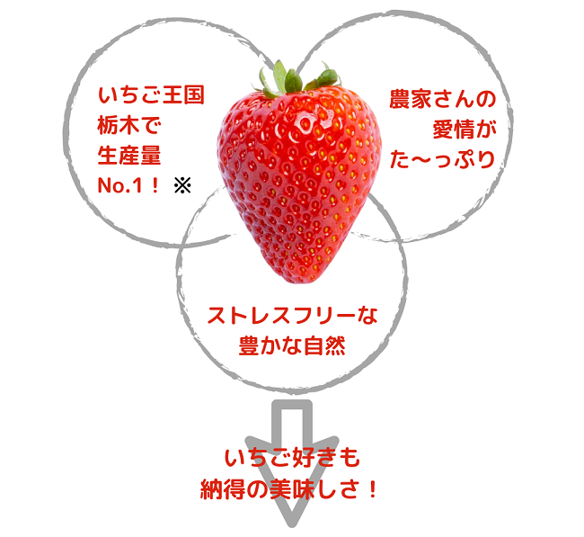 ![]() とちあいか栃木で誕生したとちあいか とちおとめと比べて酸味が少なく甘さが際立つ品種で、たくさん食べられるいちごです |